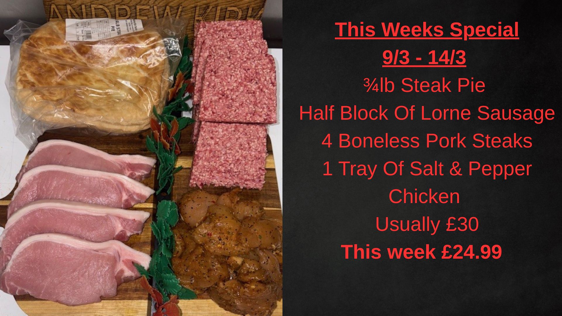 3/4 lb Steak Pie Half Block Of Lorne Sausage 4 Boneless Pork Steaks 1 Tray Of Salt & Pepper Chicken Usually £30 This Week £24.99